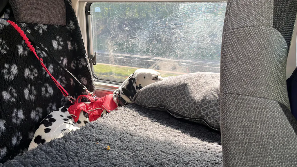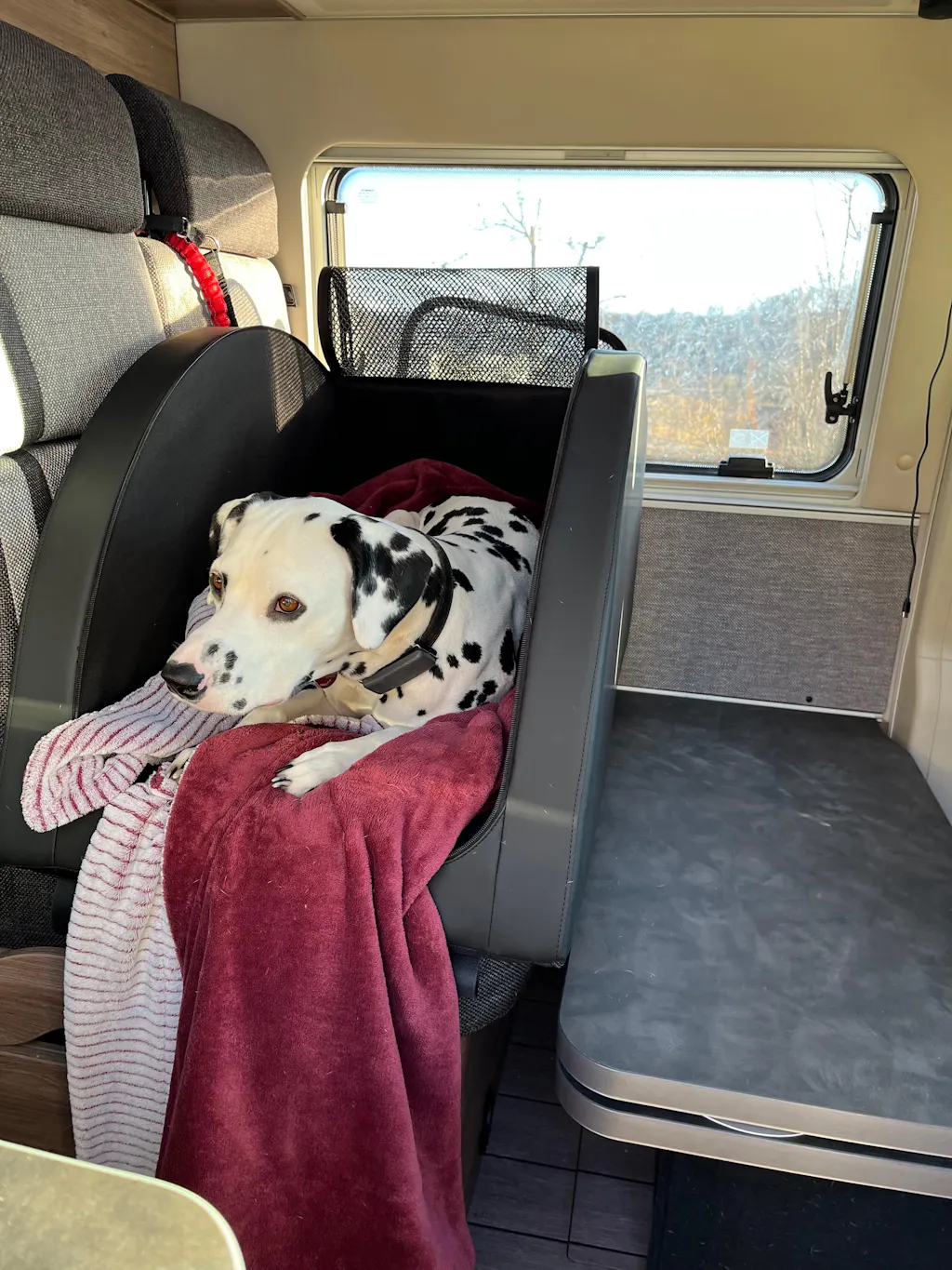 Bestellung Gr L, obwohl für den Dalmatiner Gr XL empfehlenswerter wäre. Grund: Sitz sollte in einen Knaus ME630 auf der Rückbank montiert werden. Rückbank hat das Maß 87x50! Der Durchgang 50 cm. Mit Bankverbreiterung hätte XL auch nicht gepasst. Wesentlich wichtiger war jedoch der Aspekt, dass der Hund und auch wir nicht mehr an der Box vorbei gekommen wären. Einstieg unmöglich! Nutzung der Küche unmöglich! Weg zur Nasszelle/Bett unmöglich!